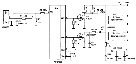 Схема на рис. 2 представляет собой один из вариантов технической реализации иммобилайзера - автомобильной охранной системы с двумя каналами блокировки работы двигателя.