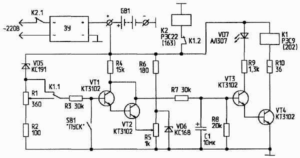Работает схема следующим образом. После подключения батареи и включения сети нажимают кнопку SB1 "Пуск". Транзисторы VT1 и VT2 закрываются, открывая ключ VT3, VT4, включающий реле К1. Оно своими нормально замкнутыми контактами К1.2 отключает реле К2, нормально замкнутые контакты которого (К2.1), замыкаясь, подключают зарядное устройство (ЗУ) к сети.