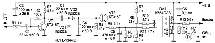 В датчике можно применить резисторы, оксидные конденсаторы и керамический С6, маломощные диоды и транзисторы структуры n-p-n любого типа. Микросхему К554СА3 можно заменить аналогом LM311, но цоколёвка у неё другая.