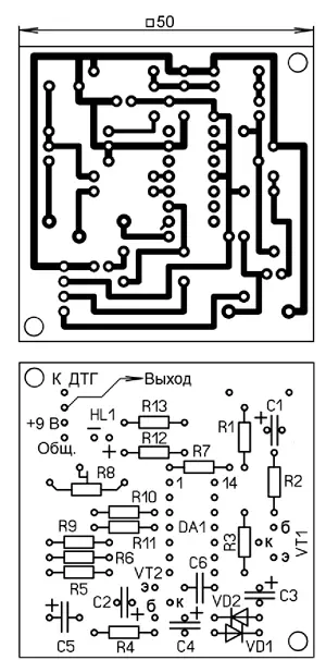 Если это устройство будет встроено в автомобиль с карбюраторным двигателем, то сопротивление резистора R1 необходимо увеличить до 100 кОм, а на его входе установить дополнительный маломощный стабилитрон (на рис. 1 не показан) на напряжение около 5 В, например КС447А. Катод стабилитрона подключают к точке соединения резистора R1 с конденсатором С1, а анод - к общему проводу. На печатной плате для стабилитрона предусмотрены две свободные контактные площадки с отверстиями.