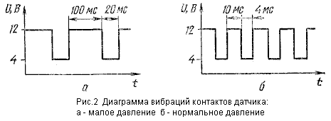 В основу работы устройства положена зависимость частоты замыкания контактов датчика масляного давления от величины масляного давления в системе. На рис. 2 показаны временные диаграммы вибрации контактов датчика, измеренные осциллографом на контакте датчика.