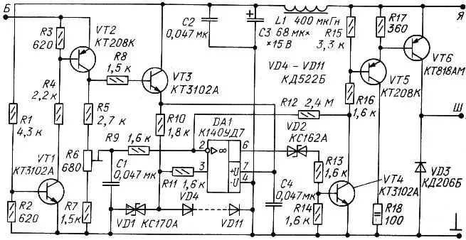 Детали. В регуляторе вместо КТ3102А (VT1, VT3, VT4) и КТ208К (VT2) могут быть использованы практически любые маломощные кремниевые транзисторы соответствующей структуры. Транзистор VT5 должен допускать ток коллектора не менее 150 мА; здесь можно использовать транзисторы из серий КТ208, КТ209, КТ313, КТ3108, КТ814, КТ816 с любым буквенным индексом. Предпочтение следует отдать транзисторам в металлическом корпусе. Стабилитрон VD2 - любой на напряжение 3,3...7 В.