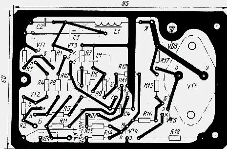 Конструкция. Все элементы регулятора, кроме диодов VD4-VD11, размещены на печатной плате размерами 93х60 мм из стеклотекстолита толщиной 1,5 мм - Чертеж платы показан на рис.2.