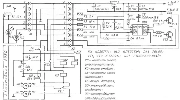 Принципиальная схема устройства изображена на рис. 1. Автомат собран на микроконтроллере DD1 (PIC12F629-04I/P), который по записанной в его память программе управляет электродвигателями омывателя и стеклоочистителя.