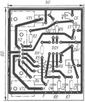 Детали электронного узла монтируют на печатной плате из фольгированного стеклотекстолита толщиной 1,5 мм. Чертеж платы показан на рис. 2. Она рассчитана на установку постоянных резисторов МЛТ, С2-33, оксидных конденсаторов К50-35 или импортных, конденсаторов С2, СЗ, С6 - К73-17. Транзисторы VT1 и VT2 привинчены к плате.