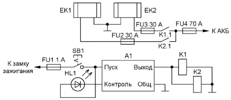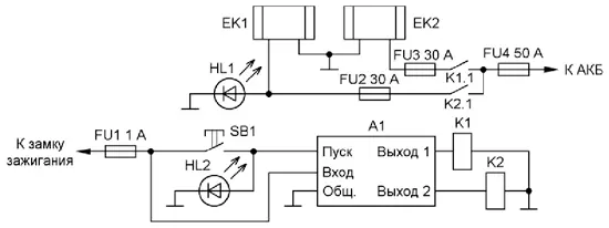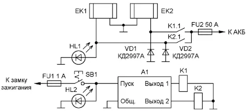 Для реализации этого устройства между моторным отсеком и салоном автомобиля необходимо протянуть всего лишь один провод для включения обмоток реле K1 и K2.