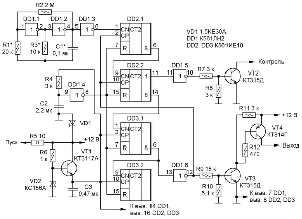 Питание блока А1 осуществляется по входу "Пуск". Резистор R5 и ограничительный диод VD1 защищают элементы устройства от бросков напряжения, возникающих в бортовой сети автомобиля. Стабилизатор напряжения 5 В собран на стабилитроне VD2 и транзисторе VT1. Задающий генератор реализован на инверторах DD1.1, DD1.2, резисторах R1-R3 и конденсаторе C1. Элемент DD1.3 - буферный. Счётчики DD2 и DD3 формируют временную задержку. Начальную установку счётчиков после включения питания осуществляет цепь на резисторе R4, конденсаторе С2 и элементе DD1.4. Мигающий режим и режим подсветки кнопки включения SB1 организованы на элементе DD1.5 и транзисторе VT2. Управление реле K1, K2 выполняет усилитель на элементе DD1.6 и транзисторах VT3, VT4. Время работы реле времени устанавливают частотой задающего генератора, подбирая сопротивление резисторов R1, R3 и ёмкость конденсатора С1, а также подключением входа элемента DD1.6 к выходу счетчика DD3.1 или DD3.2.