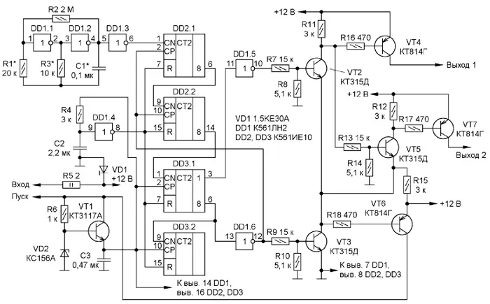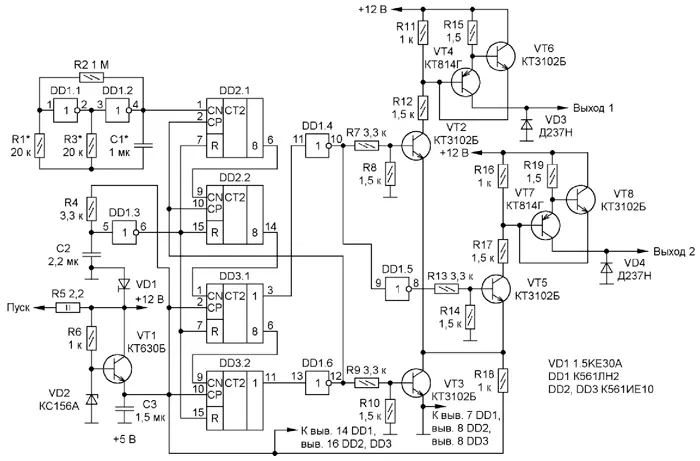 Блок А1 для варианта облегчённого режима обогрева лобового стекла собран на аналогичных функциональных узлах, как предыдущий, с отличием, что питание стабилизатора напряжения 5 В от защитного ограничителя осуществляется с помощью транзистора VT6. Введены два одинаковых усилителя, которые собраны на транзисторах VT2, VT4 и VT5, VT7, работающих в противофазе в зависимости от уровня сигнала на выходах счётчика dD3 с периодом включения/выключения 3...5 с. При включении устройства после нажатия на кнопку SB1 входное напряжение с контакта "Вход" кратковременно подаётся на контакт "Пуск", что приводит к открыванию транзисторов VT3 и VT6, обеспечивающих "подхват" питания на время включения устройства, и соответственно к началу работы стабилизатора 5 В. По окончании времени работы блока А1 (2...8 мин) высокий уровень с выхода 8 (вывод 6) счётчика DD3.1 блокирует работу счётчиков DD2.1, DD2.2. Кроме того, закрывается транзистор VT3 и закрывает транзистор VT6, который отключает напряжение питания 5 В блока А1. В этом варианте время работы устройства устанавливают аналогично.