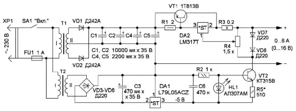 Для питания стабилизатора тока на транзисторе VT2 служит блок питания, собранный на трансформаторе Т2, выпрямителе на диодах VD3-VD6 и стабилизаторе напряжения на микросхеме DA1. Конденсатор С3 - сглаживающий.