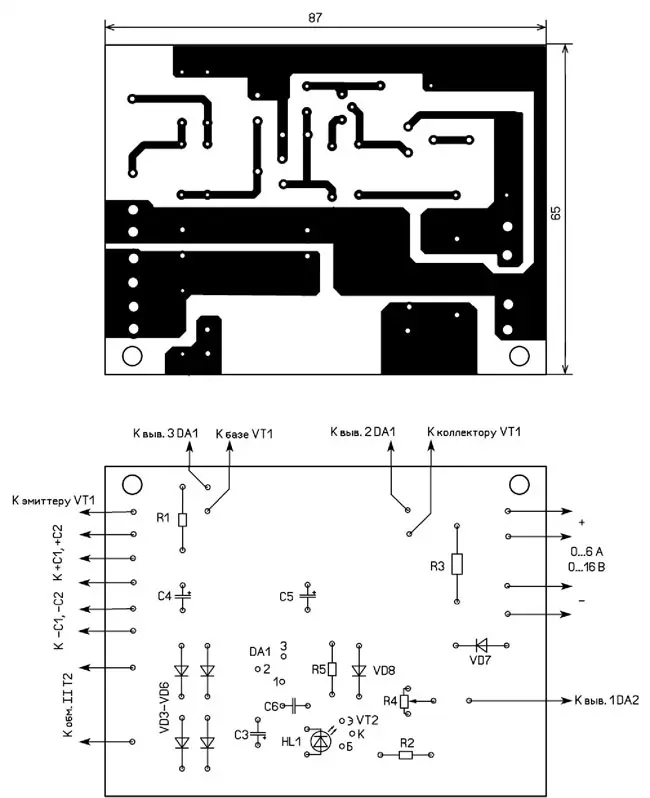 Часть элементов стабилизатора смонтирована на печатной плате из одностороннего фольгированного стеклотекстолита толщиной 2 мм, её чертёж показан на рис. 3 (на плате установлен подстроечный резистор R5). Микросхема DA2 установлена на ребристый теплоотвод общей площадью 60 см2. Транзистор VT1 установлен на теплоотвод общей площадью около 900 см2. Если работы проводятся при температуре окружающего воздуха 30 оС и выше, следует предусмотреть обдув устройства с помощью внешнего вентилятора.