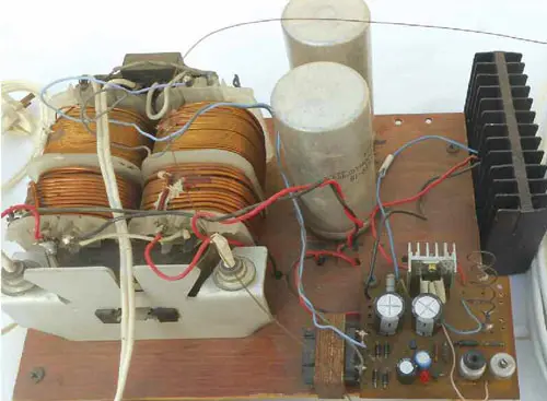 В авторском варианте применён понижающий трансформатор Т1 от зарядного устройства "Рассвет-2". От него использован и алюминиевый теплоотвод толщиной 3 мм размерами 130x70 мм, на котором установлены диоды VD1, VD2. Трансформатор можно изготовить из трансформаторов серий ТС-180, ТС-200, применявшихся в чёрно-белых телевизорах. Их вторичные обмотки удаляют и наматывают новые - на каждом каркасе 78 витков провода ПЭТВ-2 диаметром 2 мм для трансформаторов ТС-200 и по 68 витков для трансформатора ТС-180. Обмотки соединяют последовательно. Трансформатор Т2 - маломощный с выходным напряжением 6...10 В и током до 50 мА. Внешний вид стабилизатора тока без корпуса показан на рис. 4.