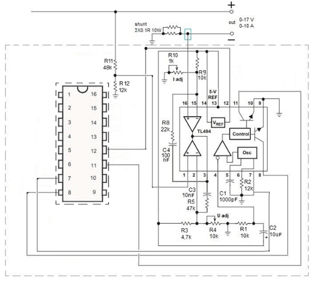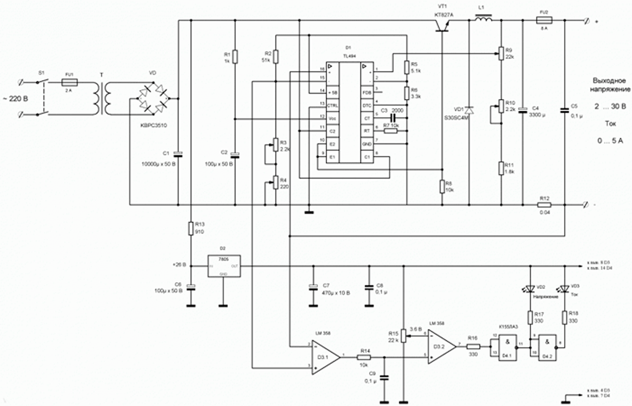 Если у вас уже есть БП на базе TL494, но он не регулируется, схему можно доработать. Пример с регулируемыми напряжением и силой тока.