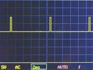 Выходной транзистор VT5 детектора ноля запускает работу регулятора зарядного тока строго после перехода сетевого напряжения через ноль. Осциллограмма напряжения на коллекторе VT5 показана на рис. 3. Здесь видны положительные импульсы длительностью примерно 0,4 мс в момент перехода сетевого напряжения через ноль, в этот момент транзистор VT5 закрыт и регулятор зарядного тока не работает. После окончания импульса транзистор VT5 открывается и подаёт питание на регулятор зарядного тока.