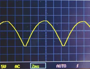 Работает ЗУ следующим образом. Заряжаемую аккумуляторную батарею подключают к клеммам Х1 и Х2 с соблюдением полярности. Регулятор зарядного тока R* устанавливается в положение максимального сопротивления (движок в левом по схеме положении - минимальный ток зарядки). Вилку ХР1 подключают в розетку электросети 230 В. Через плавкую вставку FU1 напряжение поступает на трансформатор Т1. Конденсатор С1 подавляет импульсные помехи. После диодной сборки VD1 пульсирующее напряжение подаётся на анод тиристора VS1, а через диоды VD3 и VD2 получают питание регулятор тока зарядки и стабилизатор напряжения на микросхеме DA1. Также пульсирующее напряжение поступает через резистор R2 на вход детектора ноля - базу транзистора VT1. Резистор R1 является общим нагрузочным. Осциллограмма изменения напряжения на выводе К диодной сбор-kuVDI показана на рис. 2.