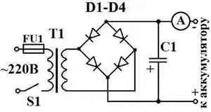 То есть, для зарядки любой батареи будет достаточно трансформатора и диодного моста, как на схеме ниже.
