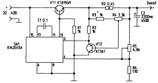 Микросхема К142ЕНЗА является регулируемым стабилизатором напряжения с системой защиты от перегрузки по току и позволяет получить выходное напряжения от 3 до 30 В при токе нагрузки до 1 А. Дополнив ее усилителем мощности на транзисторе VT1 и регулируемой схемой токовой защиты, получим универсальный надежный БП.