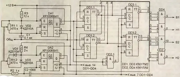 Частота колебаний задающего генератора на таймере DA1 регулируется переменным резистором R1.1 в пределах 32...832 Гц. Необходимые для управления двумя узлами А2 последовательности импульсов формируются с помощью триггеров микросхем DD1, DD3 и логических элементов микросхем DD2, DD4 на выходах В1, Н1, В2, Н2. Паузы между импульсами открывающими "верхние" и "нижние" ключи этих узлов, нужные для предотвращения протекания через них "сквозного" тока, образуются за счет задержки переключения триггеров микросхемы DD3 относительно триггеров микросхемы DD1 создаваемой путем инверсии элементом DD2.1 подаваемых на триггеры импульсов задающего генератора.