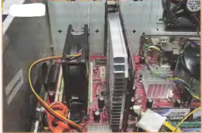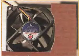 У основания отпиливают один из углов, и на его место прикрепляют двумя винтами (или шурупами-саморезами) готовый компьютерный вентилятор типоразмера 80 мм на напряжение 12 В. В результате должна получиться сборка, подобная показанной на фото рис. 1 Нижней по фото частью (шириной около 13 мм) эту сборку вставляют в ближайший к видеокарте слот материнской платы компьютера.