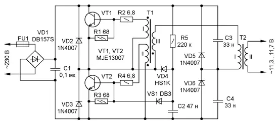 Один из наиболее простых и распространённых вариантов схемных решений для понижающих электронных трансформаторов - это полумостовой преобразователь с положительной обратной связью по току, схема которого приведена на рис. 1. При подключении устройства к сети конденсаторы С3 и С4 быстро заряжаются до амплитудного напряжения сети, формируя половинное напряжение в точке соединения. Цепь R5C2VS1 формирует запускающий импульс. Как только напряжение на конденсаторе С2 достигнет порога открывания динистора VS1 (24.32 В), он откроется и к базе транзистора VT2 будет приложено прямое напряжение смещения. Этот транзистор откроется, и ток потечёт по цепи: общая точка конденсаторов С3 и С4, первичная обмотка трансформатора Т2, обмотка III трансформатора Т1, участок коллектор - эмиттер транзистора VT2, минусовый вывод диодного моста VD1. На обмотке II трансформатора Т1 появится напряжение, поддерживающее транзистор VT2 в открытом состоянии, при этом к базе транзистора VT1 будет приложено обратное напряжение от обмотки I (обмотки I и II включены противофазно). Протекающий через обмотку III трансформатора Т1 ток быстро введёт его в состояние насыщения. Вследствие этого напряжение на обмотках I и II Т1 устремится к нулю. Транзистор VT2 начнёт закрываться. Когда он почти полностью закроется, трансформатор станет выходить из насыщения.