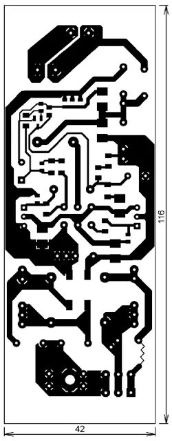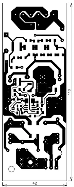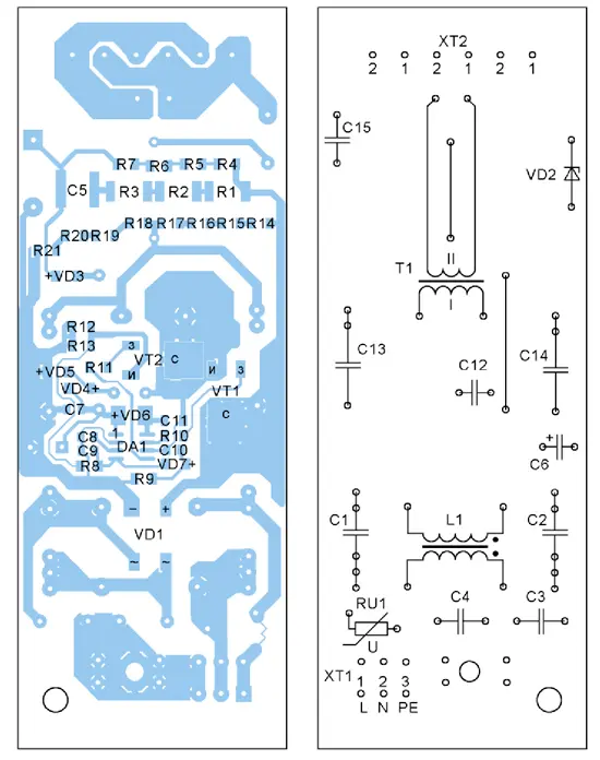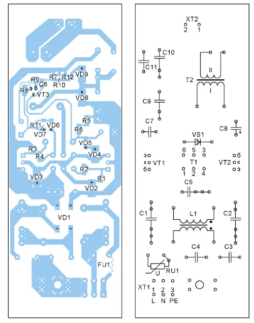 Рис. 6. Чертёж печатной платы первого варианта электронного трансформатора