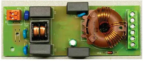 Трансформатор Т1 намотан на кольцевом магнитопроводе с магнитной проницаемостью 2300 ±15 %, его внешний диаметр - 10,2 мм, внутренний диаметр - 5,6 мм, толщина - 5,3 мм. Обмотка III (5-6) содержит один виток, обмотки I (1-2) и II (3-4) - по три витка провода диаметром 0,3 мм. Индуктивность обмоток 1-2 и 3-4 должна быть 10...15 мкГн. Выходной трансформатор Т2 намотан на магнитопроводе EV25/13/13 (Epcos) без немагнитного зазора, материал N27. Его первичная обмотка содержит 76 витков провода 5x0,2 мм. Вторичная обмотка содержит восемь витков литцендрата 100x0,08 мм. Индуктивность первичной обмотки равна 12 ±10 % мГн. Дроссель помехоподавляющего фильтра L1 намотан на маг-нитопроводе Е19/8/5, материал N30, каждая обмотка содержит по 130 витков провода диаметром 0,25 мм. Можно применить подходящий по габаритам стандартный двухобмоточный дроссель индуктивностью 30...40 мГн. Конденсаторы С1, С2 желательно применить Х-класса.