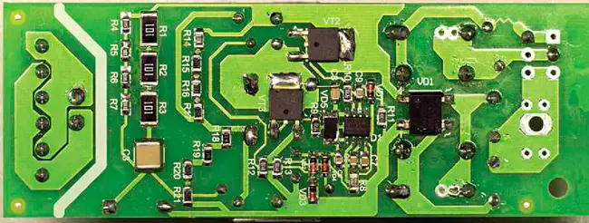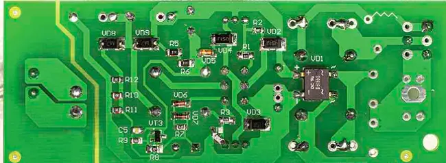 Чертёж печатной платы первого варианта электронного трансформатора (см. рис. 4) приведён на рис. 6, расположение элементов - на рис. 7. Внешний вид собранной платы показан на рис. 8. обложки. Электронный трансформатор собран на плате из фольгированного с одной стороны стеклотекстолита толщиной 1,5 мм. Все элементы для поверхностного монтажа установлены со стороны печатных проводников, выводные - на противоположной стороне платы. Большинство деталей (транзисторы VT1, VT2, трансформатор Т1, динистор VS1, конденсаторы С1-С5, С9, С10) подойдут от массовых дешёвых электронных балластов для люминесцентных ламп типа Т8, например, Tridonic PC4x18 T8, Fintar 236/418, Cimex CSVT 418P, Komtex EFBL236/418, TDM Electric EB-T8-236/418 и др., поскольку они имеют схожую схемотехнику и элементную базу. Конденсаторы С9 и С10 - металлоплёночные полипропиленовые, рассчитанные на большой импульсный ток и переменное напряжение не менее 400 В. Диод VD4 - любой быстродействующий с допустимым обратным на рис 11 пряжением не менее 150 В.