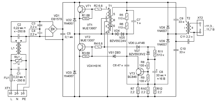 На рис. 4 приведена схема усовершенствованного электронного трансформатора, в который добавлены помехоподавляющий фильтр и узел защиты от короткого замыкания в нагрузке. Узел защиты собран на транзисторе VT3, диоде VD6, стабилитроне VD7, конденсаторе C8 и резисторах R7-R12. Резкое увеличение тока нагрузки приведёт к увеличению напряжения на обмотках I и II трансформатора Т1 с 3...5 В в номинальном режиме до 9...10 В в режиме короткого замыкания. В результате на базе транзистора VT3 появится напряжение смещения 0,6 В. Транзистор откроется и зашунтирует конденсатор цепи запуска С6. В результате со следующим полупериодом выпрямленного напряжения генератор не запустится. Конденсатор С8 обеспечивает задержку отключения защиты около 0,5 с.