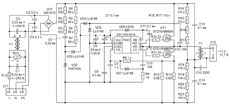 Вход CS (вывод 4) микросхемы DA1 является входом внутреннего усилителя сигнала ошибки и используется для контроля тока нагрузки и напряжения на выходе полумоста. В случае резкого увеличения тока нагрузки, например, при коротком замыкании, падение напряжения на датчике тока - резисторах R12 и R13, а следовательно, и на выводе 4 DA1 превысит 0,56 В, внутренний компаратор переключится и остановит тактовый генератор. В случае же обрыва нагрузки напряжение на выходе полумоста может превысить предельно допустимое напряжение транзисторов VT1 и VT2. Чтобы избежать этого, к входу CS через диод VD7 подключён резистивно-ёмкостный делитель C10R9. При превышении порогового значения напряжения на резисторе R9 генерация также прекращается. Более подробно режимы работы микросхемы IR2161S рассмотрены в [1].