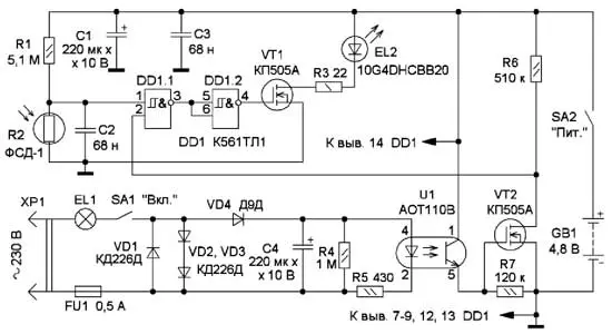 В устройстве применены резисторы МЛТ, ОМЛТ, С2-33 и аналогичные с до-пуском ± 20 %. Конденсаторы С1, С4 - К50-35 или импортные, конденсаторы С2, С3 - керамические, К10-17 или плёночные серии К73, или импортные. Диоды VD1-VD3 - любые из серии КД226 или Ш400х, диод Д9Д можно заменить любым маломощным германиевым или диодом Шоттки. Светодиод EL2 - любой одиночный сверхъяркий любого свечения, транзисторная оптопара U1 - АОТ110, 3ОТ110 с любым буквенным индексом. Полевой транзистор КП505А (VT1) можно заменить транзистором КП505Г и даже мощным IRF540. Транзистор КП505А (VT2) можно заменить транзисторами КП501А, КП504А. Микросхему К561ТЛ1 можно заменить зарубежным аналогом - микросхемой CD4093А. В любом случае для надёжной работы устройства неза-действованные входы элементов подключают к общему проводу или к линии питания. Предохранитель FU1 при мощности EL1 до 60 Вт - на ток 0,5 А, а при мощности лампы EL1 от 75 до 150 Вт - на ток 1 А. Выключатель SA2 - MTS102, SMTS102 или любой другой малогабаритный. Батарея GB1 составлена из четырёх аккумуляторов типоразмера АА или ААА. Лампа накаливания EL1 - на напряжение 230 В и мощностью от 25 до 100 Вт (лампы набольшую мощность просто не производятся).