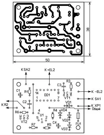 Рис. 2. Чертёж печатной платы устройства аварийного освещения и размещение элементов на ней
