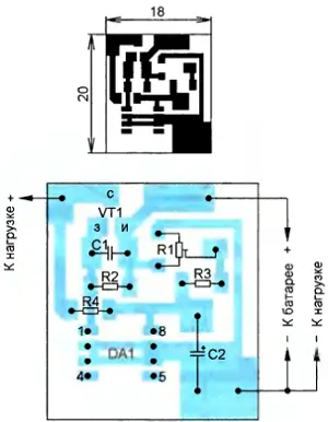 При использовании малогабаритных деталей для поверхностного монтажа габариты устройства можно сделать небольшими. Для примера на рис. 2 показан эскиз печатной платы при использовании микросхемы TL431CD в корпусе SO-8 и транзистора IRLML6402P в корпусе SOT-23. Этот транзистор имеет сопротивление канала в открытом состоянии 0,06 Ом и малый ток утечки в закрытом состоянии (несколько микроампер). Он обеспечивает коммутацию тока до 2...3 А. Подстроечный резистор R1 — POZ3AN. Оксидный конденсатор — танталовый импортный типоразмера D. Резисторы — Р1-12.