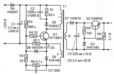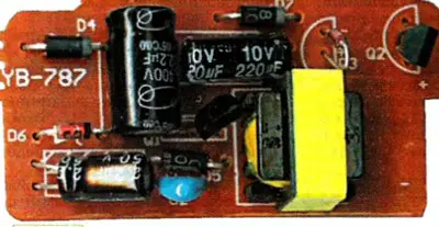 Одно из них было разобрано (рис. 1), и по печатной плате и имеющейся на ней маркировке элементов была составлена его принципиальная схема, показанная на рис. 2 (отсутствие на ней резистора R7 и конденсатора С4 объясняется отсутствием их на плате). Проверка устройства на работоспособность показала, что при увеличении тока нагрузки от 0 до 500 мА выходное напряжение уменьшается с 5,15 до 4,2 В, при этом напряжение на конденсаторе С5 понижается с 7 до 5 В. Для испытания на длительную работу устройство было нагружено током 0,5 А. Примерно через 30 мин оно вышло из строя - оказались повреждёнными транзистор Q1, диод D6, стабилитрон D8 и резисторы R2, R4, при этом температура корпусов обоих транзисторов и трансформатора Т1 достигла 80...90 °С.