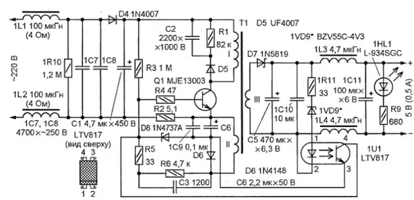 направлении; оксидный конденсатор С1 заменён конденсатором большей ёмкости и с большим номинальным напряжением; резисторы R2-R4 заменены резисторами большего сопротивления; вместо транзистора KF13001 (Q1) применён более мощный MJE13003; диод 1N4007 (D5) заменён быстродействующим UF4007 (вместе с увеличением сопротивления резистора R3 это позволило уменьшить на 1 мА потребляемый устройством ток от сети 220 В при токе нагрузки 500 мА). Кроме того, на выходе устройства установлен LC-фильтр 1L31L41C10. Светящийся светодиод 1HL1 индицирует наличие выходного напряжения. Резистор 1R10 разряжает конденсаторы 1С7, 1С8 после отключения устройства от сети.