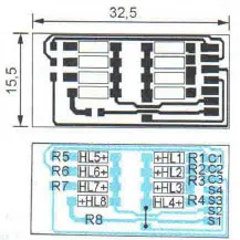 Индикатор смонтирован на односторонней печатной плате из фольгирован-ного стеклотекстолита, показанной на рис. 3. Её размеры точно такие же, как у заменяемого ЖКИ. Внешний вид собранной платы со стороны монтажа показан на рис. 4. Светодиоды в прямоугольных корпусах сечением 2x5 мм вставлены со стороны печатных проводников в вырезанные в плате отверстия. Резисторы - для поверхностного монтажа типоразмера 0805. Имеется одна перемычка типоразмера 1206.