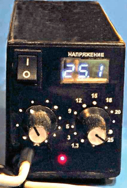 На рис. 1 представлена принципиальная схема компактного лабораторного блока питания с регулируемым в пределах 1,3...25 В выходным напряжением. Он имеет регулируемую защиту по максимальному току нагрузки, звуковой сигнализатор замыкания выхода и встроенный цифровой вольтметр. Устройство можно использовать не только для питания различных аппаратов, но и для зарядки аккумуляторных элементов током 0,2...1,5 А без применения дополнительных приспособлений для регулировки зарядного тока.