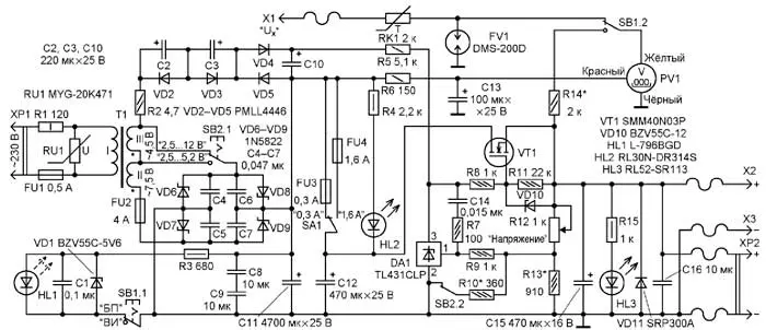Напряжение сети 230 В поступает на первичную обмотку понижающего трансформатора T1 через плавкую вставку FU1 и защитный резистор R1. С вторичных обмоток II и III напряжение переменного тока через плавкую вставку FU2 и замкнутые контакты переключателя SB2.1 поступает на выпрямительный мост, составленный из диодов VD6-VD9. В верхнем (по схеме) положении переключателя выходное напряжение БП можно установить в интервале 2,5...12 В, в нижнем - 2,5...5,2 В, что повышает КПД и уменьшает нагрев устройства при его работе с выходным напряжением ниже 5,2 В. В выпрямителе применены диоды Шотки (со значительно меньшим прямым падением напряжения, чем у обычных выпрямительных кремниевых диодов), что также повышает КПД устройства, поскольку позволяет полнее использовать напряжение вторичных обмоток трансформатора. Варистор RU1 защищает трансформатор и диоды Шотки от всплесков напряжения сети.