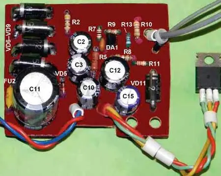 Для регулирования выходного напряжения применена интегральная микросхема TL431CLP (DA1). Выходное напряжение устанавливают переменным резистором R12. Чем меньше его введённое сопротивление, тем меньше выходное напряжение. На мощном полевом транзисторе VT1 реализован истоковый повторитель напряжения. Стабилитрон VD10 защищает изолятор затвора полевого транзистора от пробоя. Чтобы получить минимально возможную разницу между входным и выходным напряжением узла стабилизатора, применён умножитель напряжения (C2, C3, C10, VD2- VD5), благодаря которому напряжение на затворе транзистора VT1 может быть больше, чем на стоке. Резистор R2 - защитный.