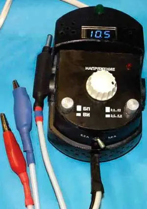 Конденсатор С14 и резистор R7 предотвращают самовозбуждение микросхемы DA1. Резисторы R8, R9 - защитные. При наличии напряжения на выходе стабилизатора светится светодиод HL3. Диод VD11 защищает элементы устройства при подключении в обратной полярности к выходу БП, например, заряженного конденсатора, аккумуляторной батареи. Для подключения БП к питаемой аппаратуре предусмотрены кабель со стандартным штекером XP2 диаметром 5,5 мм и два отдельных провода с зажимами "крокодил" на концах, что повышает удобство пользования устройством. На провод со штекером ХР2 надета подвижная термоусаживаемая трубка, которая отформована таким образом, что её можно использовать как защитный чехол.