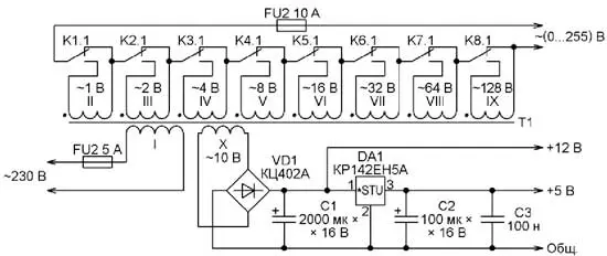 Схема лабораторного трансформатора (без блока управления) изображена на рис. 1. От схемы из упомянутой выше статьи А. Терскова она отличается только тем, что ручные переключатели заменены электромагнитными реле. Их контактные группы K1.1-K8.1 соединены так, что при обесточенных обмотках всех реле напряжение на выходе отсутствует. Так сделано для того, чтобы при переходных процессах, возникающих при включении трансформатора в сеть, на выходе не появилось напряжение. Максимальное напряжение (255 В) на выходе будет только в том случае, если сработали все реле.