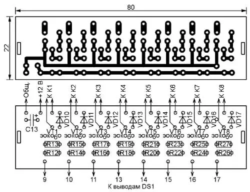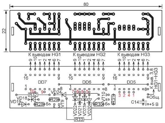 Печатная плата для блока управления не разрабатывалась, однако часть узлов можно разместить на печатных платах, представленных на рис. 3 и рис. 4. Они в своё время разработаны для других устройств, но подойдут и для представленного в статье. Остальные элементы можно смонтировать на макетной плате, соединив их выводы монтажным проводом. Блокировочные конденсаторы C5-C10 устанавливают непосредственно на выводах питания микросхем. Обратите внимание, что на рис. 3 выделены цветом номера точек подключения платы индикации к выходам счётчиков. Эти номера совпадают с номерами проводов соответствующего жгута на схеме рис. 2.