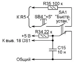 Если необходимо, можно ускорить установку напряжения, введя дополнительный переключатель SA1 и кнопку SB4 согласно схеме, показанной на рис. 5. При показанном на ней положении переключателя SA1 устройство работает как обычно. При включении режима быстрой установки все реле будут выключены, что сделает напряжение на выходе трансформатора нулевым. Кнопкой SB4 подключают параллельно резистору R5 резистор R35, увеличивая этим частоту генератора приблизительно в пять раз. Теперь можно быстро установить на индикаторе нужное значение, а затем, вернувшись в обычный режим, получить на выходе требуемое напряжение.