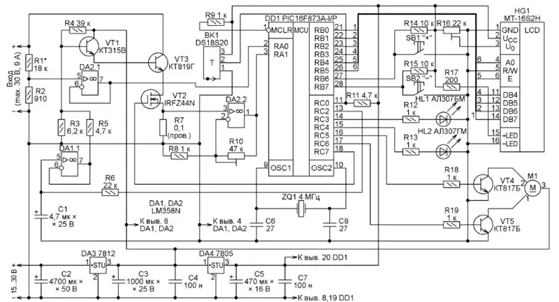 Для интегральных стабилизаторов DA3 и DA4 теплоотвод не требуется. Ток, потребляемый эквивалентом нагрузки от источника его питания, не превышает 250 мА и расходуется в основном на подсветку табло ЖКИ. При замене индикатора указанного на схеме типа на WH1602D можно подборкой резистора R17 уменьшить ток потребления до 90 мА. Если же совсем отключить подсветку, он снизится ещё больше.