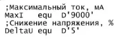 Заданные в программе пороги уменьшения напряжения проверяемого устройства под нагрузкой и срабатывания токовой защиты можно изменить, но для этого требуется вмешательство в исходный текст программы (имеющийся в приложении файл rez.asm). Информация о порогах записана в его первых строках, как показано в таблице.