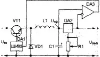Структурная схема устройства показана на рис.1. Входное напряжение Uвх трансформируется ШИМ-преобразователем DA1 в промежуточное Uпр, которое, в свою очередь, является входным для аналогового стабилизатора DA2. Обратная связь через дифференциальный усилитель DA3 поддерживает необходимое для DA2 падение напряжения (для LM317 - 2,5 В), благодаря чему тепловые потери на DA2 минимальны.