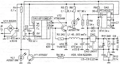Принципиальная схема источника питания изображена на рис.2. Выпрямленное напряжение с выхода моста VD1 сглаживается конденсатором С1 и подается на вход ШИМ преобразователя, собранного на элементах DA1, VT2, VD2, L1. Схема включения DA1 - типовая понижающая [1]. Применение микросхемы КР1156ЕУ5 свело к минимуму число пассивных элементов, но наложило ограничение на максимальное входное напряжение, которое в таком включении не должно превышать 40 В. ШИМ с помощью накопительного дросселя L1 и диода VD2 формирует промежуточное напряжение Uпр на конденсаторе С4.