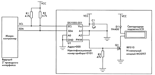 Выпускаемый 5-ти разрядный программируемый потенциометр DS 1050 используется в качестве основного элемента широтно-импульсного модулятора (ШИМ). Изменение ширины импульса от 0 до 100% с шагом в 3, 125%. Управление потенциометром осуществляется по двухпроводному последовательному интерфейсу, совместимому с I? C, с адресацией до восьми DS 1050 на двухпроводной шине. Схемное решение управления яркостью светодиодной подсветкой жидкокристаллического индикатора представлено на рис. 1.
