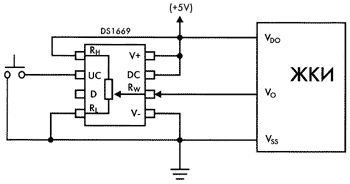 Для управления контрастом жидкокристаллических индикаторов (ЖКИ) вместо традиционных механических потенциометров предлагается использовать цифровой потенциометр типа DS1668/1669 Dallastats или DS 1803. Приборы DS1668/1669 были выбраны, потому что они обеспечивают как кнопочное, так и микроконтроллерное управление токосъемного контакта. Важно также, что эти приборы имеют внутреннюю энергонезависимую память, которая позволяет сохранять положение токосъемника без подачи электропитания. На рис. 2. представлена схема для управления контрастом для ЖКИ с использованием цифрового потенциометра DS 1669.