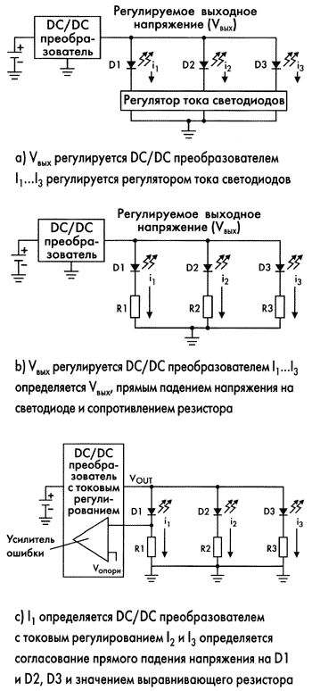 Есть три основных способа параллельного подключения светодиодов, как показано на рис. 3.