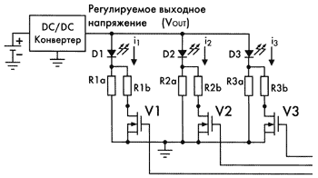 Использование преобразователя с регулируемым выходным током. На рис. 3с показан принцип использования преобразователя с регулируемым выходным током. В этом сценарии ток через один из диодов (рис. 3с - D1) преобразован в падение напряжения на резисторе R1 и именно это напряжение поддерживается преобразователем. Преобразователь может быть ключевого типа, на переключаемых конденсаторах или линейным регулятором.