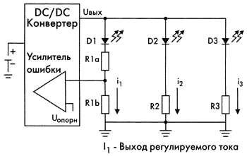 где: Vo.c - напряжение обратной связи снимаемое с резистора R1.Поскольку регулируется ток только одного диода, разное прямое падение напряжения на светодиодах может вызывать различие протекаемых через них токов. В этом случае можно использовать следующее. Разделим резистор на 2 части: R1 = R1A + R1B и подставим в уравнение (1), а значение R1 в уравнении (2) заменим на R1В. Для R2 и R3 не требуется разбиения резисторов. Их значения должны быть равны R1A + R1B. Теперь на выходе регулятора будет поддерживаться напряжение, определяемое падением напряжения на резисторе R1B, как показано на рис. 6. Если уставка от R1B равна напряжению R1, то усилитель рассогласования останется в прежнем состоянии, выходное напряжение регулятора повысится, что обеспечит согласование токов через каждый светодиод.